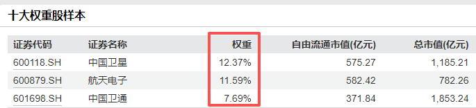 万得商业航天主题指数的前三大权重股。图片来源:Wind