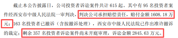 航天动力近期披露的诉讼进展公告显示,公司已收到陕西省西安市中级人民法院的一审判决及裁定。在相关投资者诉公司证券虚假陈述责任纠纷案件中,95 名投资者的诉讼案件已宣判,公司需向该部分投资者赔付1608.18万元(含诉讼费等相关费用);另有146名投资者撤回起诉,并获得法院准许。截至公告披露日,公司累计涉及的投资者诉讼案件已达615起,其中357起案件尚未开庭审理,涉诉金额高达2845.63万元。