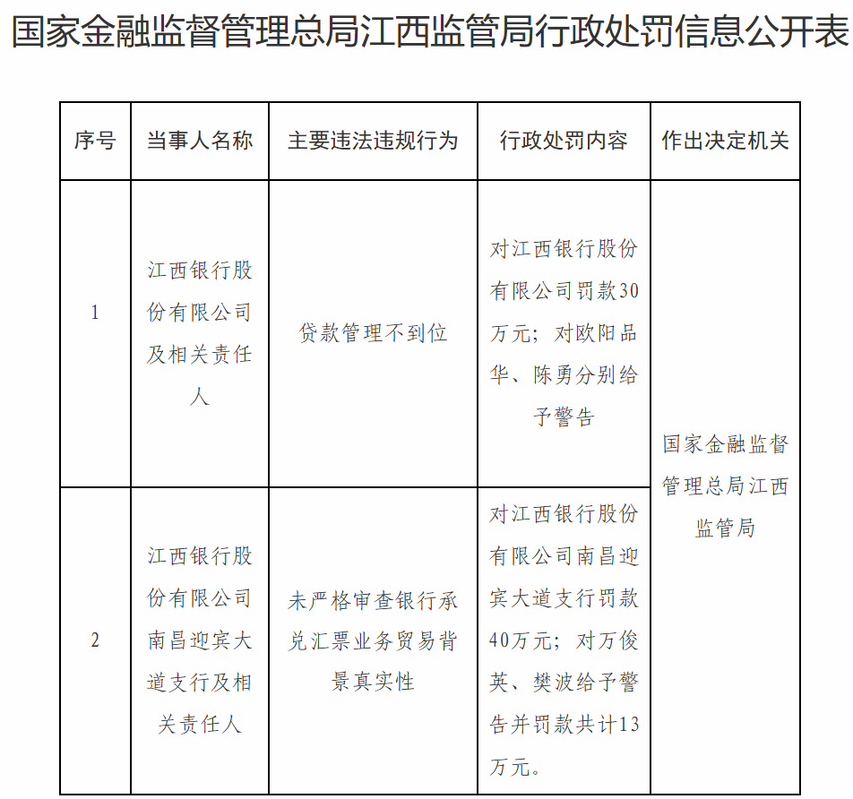 从此次披露的信息来看,因贷款管理不到位,国家金融监督管理总局江西监管局对江西银行罚款30万元;对两名相关责任人分别给予警告。