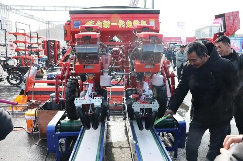 韩义龙接着指向智能电动系统:“电驱气吸技术加上智能控制系统,让它在12公里的时速下作业,每一粒种子都能找到它该去的地方,不深不浅,间距均匀。”旁边的技术人员补充道:“在免耕机行业里,这算是最先进的一款了。”人群中,有人蹲下来查看开沟器的角度,有人伸手摸一摸施肥箱的材质,仿佛在掂量这台“铁牛”的分量。