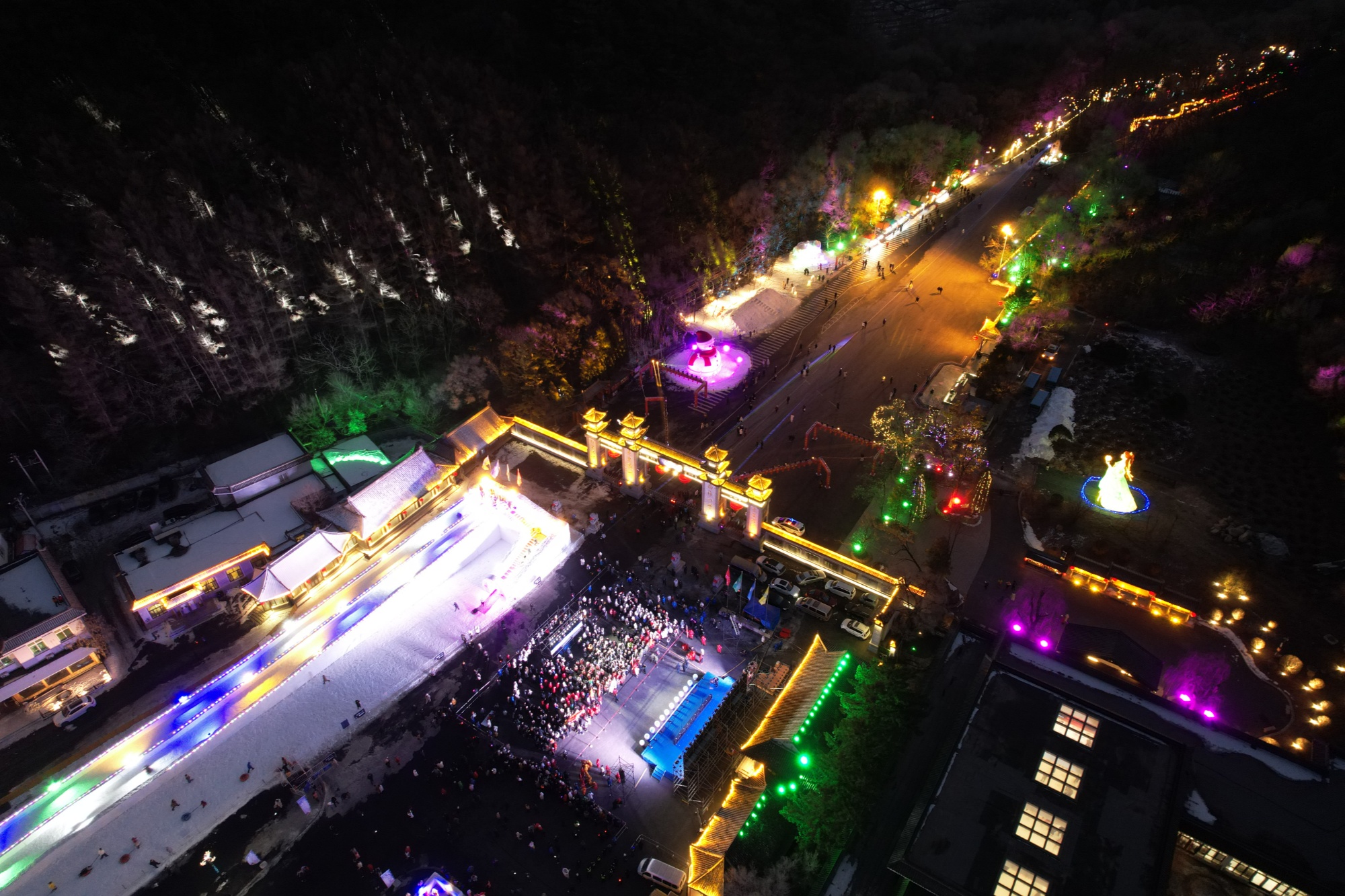 跨年迎新之夜,千山客流涌动,人山人海,每个人脸上都洋溢着欢乐和幸福。很多身着汉服的游人穿梭于冰雪花灯的世界,成为一道亮丽的风景。