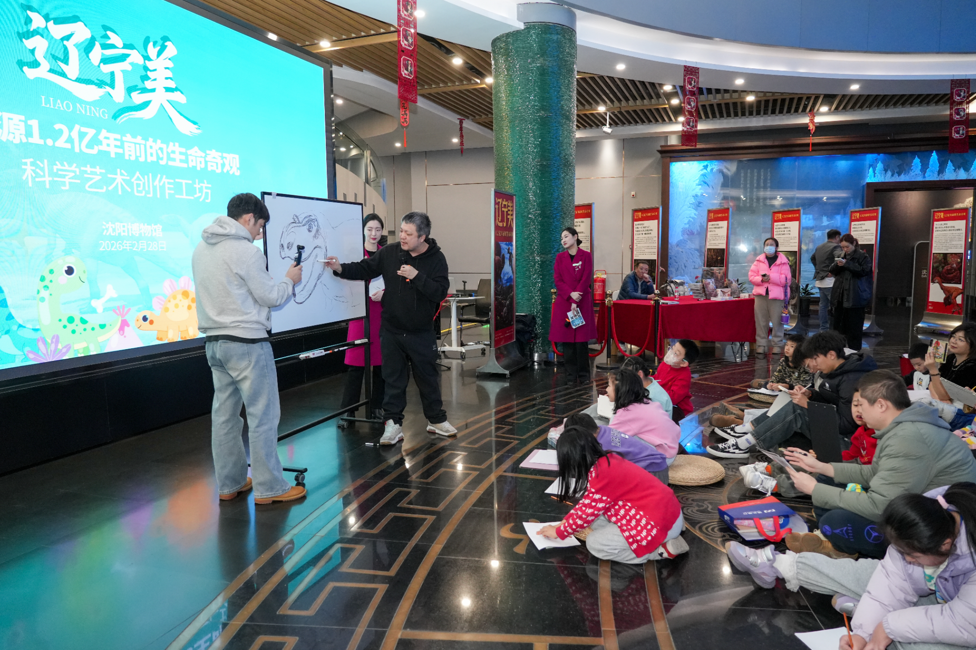 2月28日下午,沈阳博物馆一楼共享大厅化身为一间充满奇思妙想的“远古画室”。作为“辽宁美·探源1.2亿年前的生命奇观——‘从沈阳,一路朝阳2’”研学游活动的压轴收官之作,科学艺术创作工坊在此精彩呈现。国际知名科学艺术家、被誉为“恐龙大王”的赵闯亲临现场,与百余名青少年及家长面对面,共同完成了一场跨越亿万年时空的科学与艺术对话。