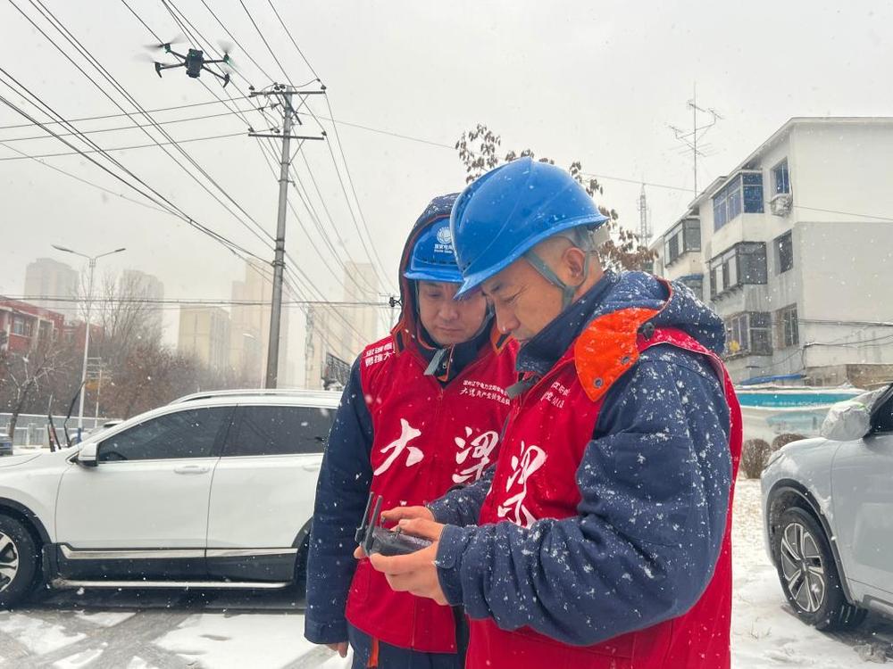在沈阳市和平区,国网沈阳供电公司配电运检人员正在利用无人机进行雪中巡检。(受访单位供图)