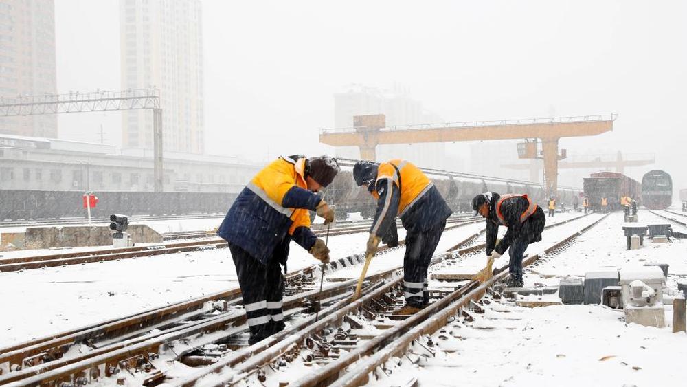 为确保铁路大动脉畅通,中国铁路沈阳局集团有限公司出动106列刮冰机车,在多条线路不间断开展接触网刮冰作业。大雪中,铁路工作人员重点对易积雪区段道岔进行循环清扫,用专用小铲一点点地铲除滑床板、连接杆夹缝中的积冰,确保道岔转换灵活。