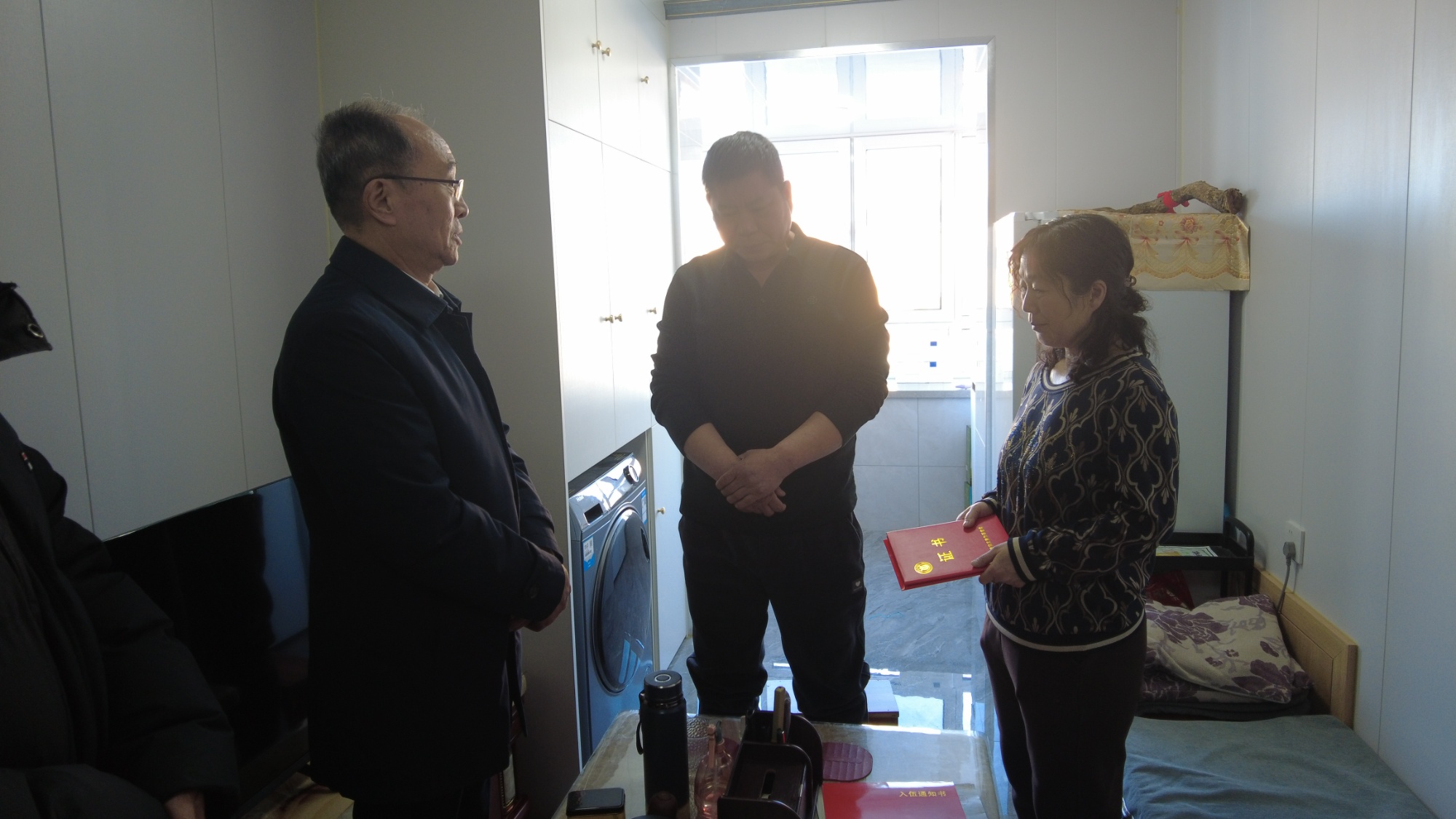 辽宁中医药大学党委书记吕晓东(中)、校长杨鸫祥(右)登门慰问(央广网记者 李子平 摄)