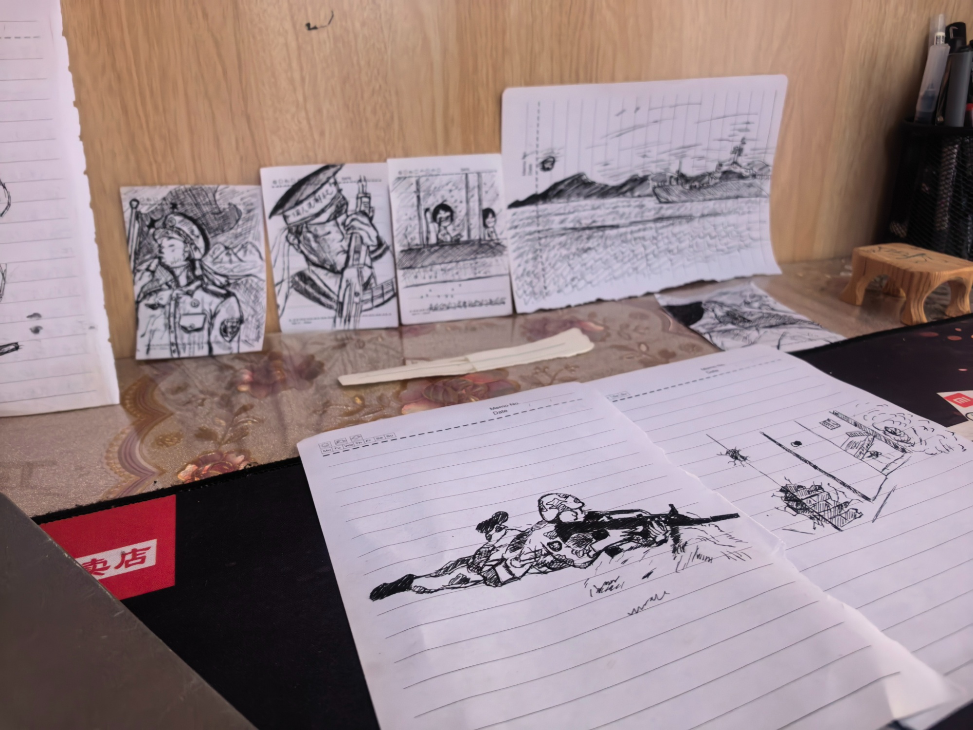 他的笔记本里写着“要到基层建功立业,把青春的热血与汗水洒到祖国最需要的地方”。笔记本中的手绘插画,也都与军旅生活有关,其中一幅他卧姿据枪瞄准的,被母亲撕了下来,放在了书桌上,是为数不多的遗物之一。