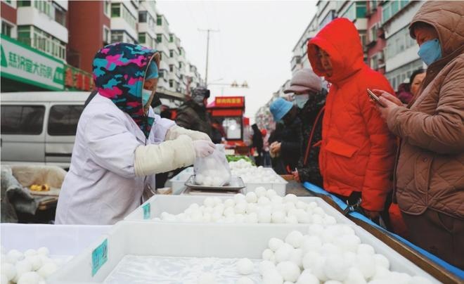 元宵佳节,元宵市场“甜蜜”升温。今年我省元宵市场主打口味多元化,不仅有黑芝麻、花生、五仁等经典口味,还推出木糖醇馅、柿柿如意、榴莲、酸奶、巧克力等新品,兼顾老幼需求。图为沈阳市皇姑区辅仁早市的手工元宵摊前,消费者选购元宵。