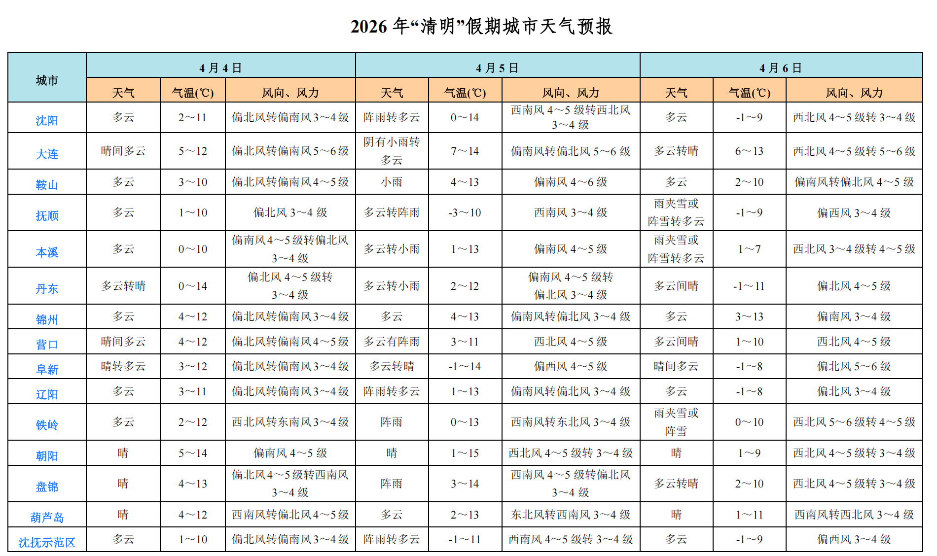 据辽宁省气象台发布的消息,预计清明假期(4月4日~6日),辽宁先晴后雨。4月5日,中东部地区有小雨。4月6日夜间,东北部地区有雨夹雪或阵雪,其他时段以晴有时多云天气为主。