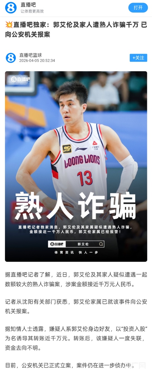 记者梳理发现,关于“郭艾伦被诈骗近千万”的消息源于直播吧App。4月5日,“直播吧篮球”账号发布《直播吧独家:郭艾伦及家人遭熟人诈骗千万已向公安机关报案》一文,相关话题很快冲上热搜。