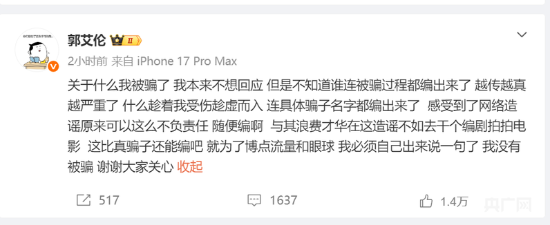 郭艾伦否认被骗(央广网发 郭艾伦微博账号截图)