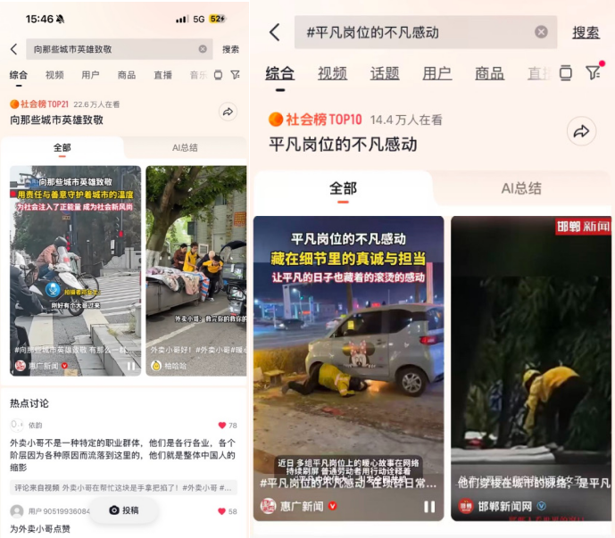 这些平凡岗位上的非凡举动、暖心瞬间在互联网持续刷屏。11月4日,话题#平凡岗位的不凡感动#登上抖音社会热点榜,话题播放量超过1200万;11月5日,话题#向那些城市英雄致敬#登上抖音社会榜,话题播放量超过2500万。亿万次播放与点赞背后,是社会情绪的真实投射,也是公众对平凡岗位上“非凡英雄”的由衷致敬。