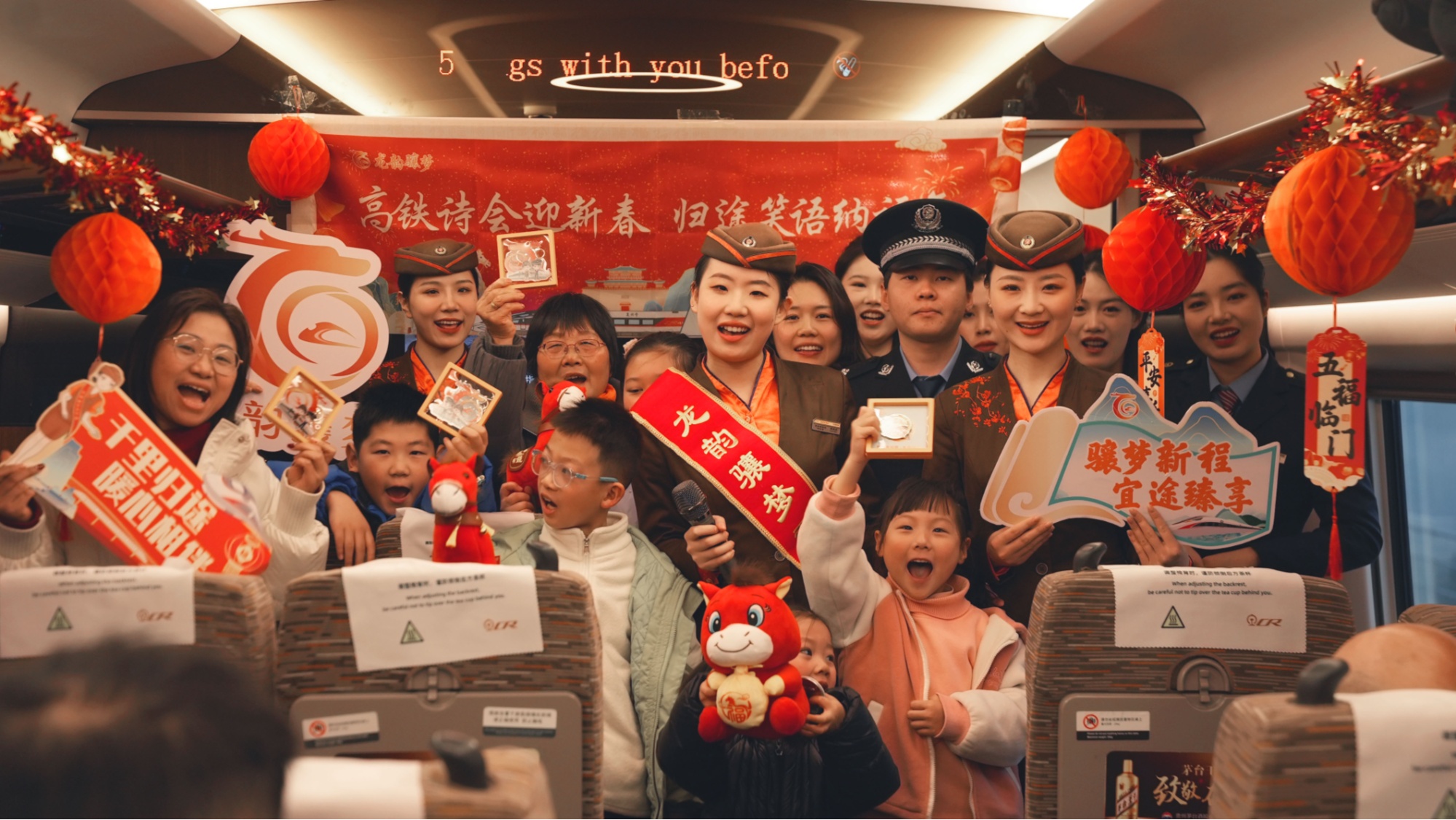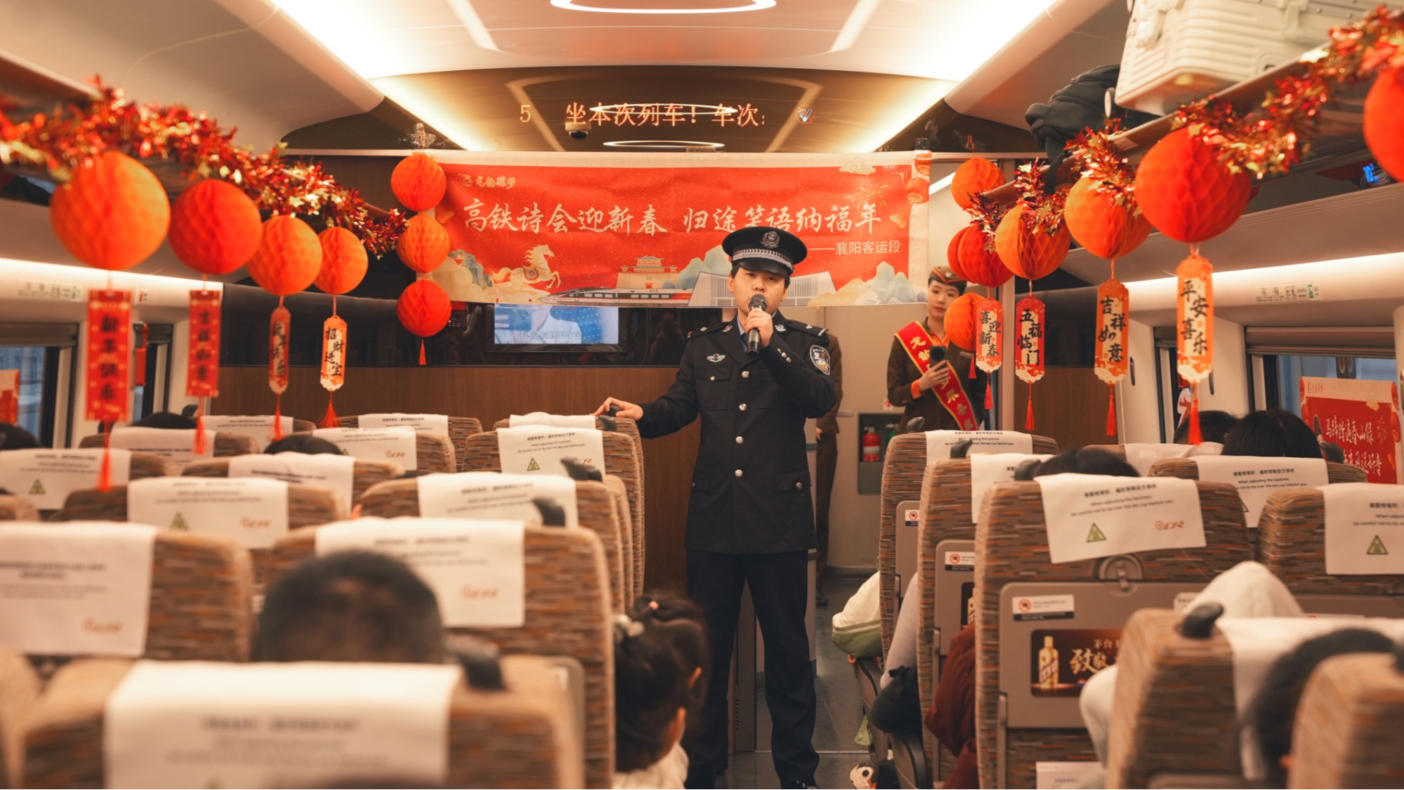 车厢内红灯高挂,诗意流淌,“诗词接龙”热烈展开。“春风得意马蹄疾”“总把新桃换旧符”……旅客争相接答,掌声不断。乘警何海涛登台献唱《少年壮志不言愁》,深情的旋律响起,瞬间打动在场旅客。他动情地说:“我们不言愁,只为守护每一份归途的平安。”