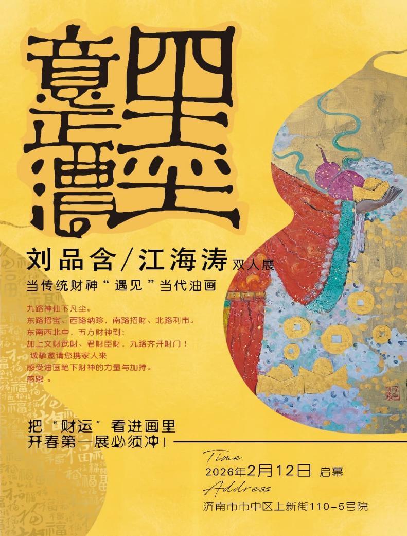 而在上新街110-5号院,上新街与独立艺术家刘品含、江海涛特别策划的“‘墨意正浓’财神作品展”,将在2月12日正式启幕。展览以财神与传统吉祥符号为主题,通过刘品含、江海涛的当代艺术语言,重新诠释中国人对美好生活的精神寄托与文化认同。其作品融合东西方绘画技法,在色彩、线条与构图中展开对话,既保留传统意象的庄重内涵,又赋予其符合现代审美的视觉张力,可为观众带来一场兼具文化厚度与艺术感染力的视觉体验。