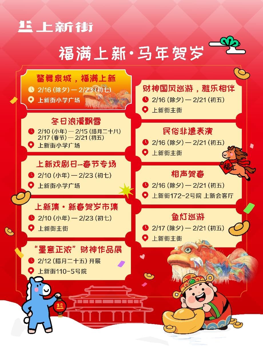 本次活动不仅延续了新春贺岁市集、舞龙舞狮等民俗表演和汉服巡游等经典节庆内容,更注入戏剧专场、主题展览、马年元素互动打卡等年轻化、艺术化表达,旨在让传统文化以更贴近当下生活的方式融入市民的节日体验。从“上新集·新春贺岁市集”到“民俗非遗展演”,从“汉服巡游-乐器演出”到“上新戏剧日-春节专场”,每一处节点都承载着节日的喜悦与文化的温度。