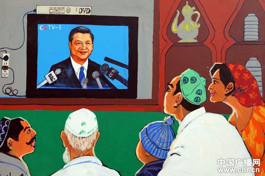 新疆农民画系列之一:爱国爱疆(中广网记者 张雷 摄)