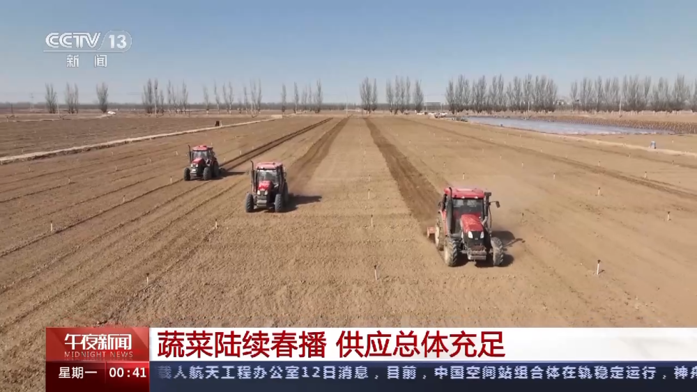 总台央视记者陈烨炜:我现在是在宁夏银川永宁的一处供外蔬菜基地里,目前这里已经开始了今年头茬蔬菜的春耕播种,在我身后,几台拖拉机正在进行翻地作业,远处的老乡们正在对播完种的地进行覆膜。