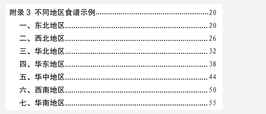 值得注意的是,这份食谱细化到了全国不同地区的食谱示例,并备注了食谱的“总能量”。