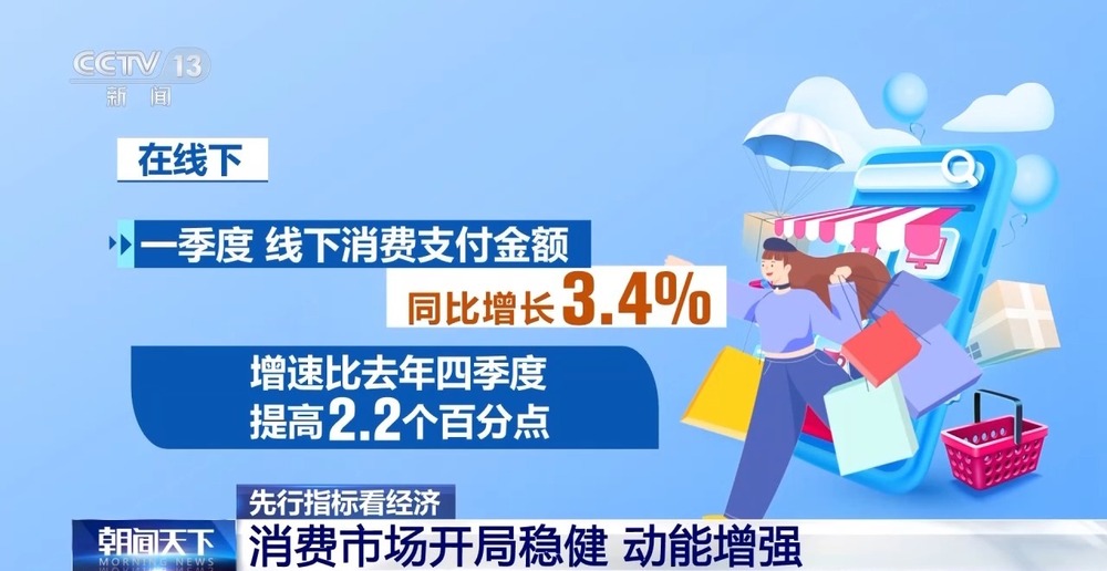 在线下,一季度线下消费支付金额同比增长3.4%,增速比去年四季度提高2.2个百分点。