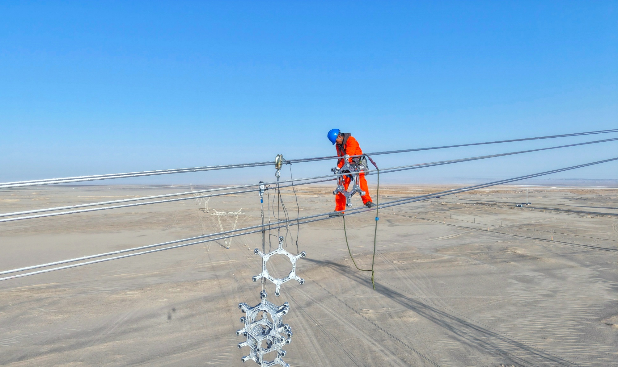 9月24日,在青海省海西蒙古族藏族自治州茫崖市境内的戈壁腹地,随着跨越档最后一相导线间隔棒的安装到位,羚羊—昆仑山Ⅰ、Ⅱ回750千伏线路工程Ⅳ标顺利完成跨越格茫公路,年度架线“终极跨越”圆满完成。此次跨越施工针对交通主干道特性构建全链条安全管控体系,为工程后续推进奠定坚实基础,也为高原电力线路跨越交通要道积累了宝贵经验。