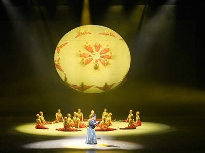 “记忆·河湟”篇章里,舞者屈膝弓步复刻彩陶盆上的原始舞姿,千年面条的考古发现被转化为群舞,演员们以肢体缠绕、舒展的动作,模拟面团发酵、抻拉的过程,每一次转身都似时光在流转。“守望·河湟”中,青海花儿的悠扬旋律里,舞者裙摆绣着河湟刺绣的“盘金绣”纹样,湟源排灯的光影投射在舞台上,红黄交织的暖光里,皮影人与真人舞者同台,仿佛古今对话。到了“筑梦·河湟”,踩着高跷的演员们踩着鼓点腾跃,脚下木跷绘着唐蕃古道的驼队图案,配合背景里渐强的驼铃声,把河湟人对未来的憧憬描绘成热烈的舞姿。