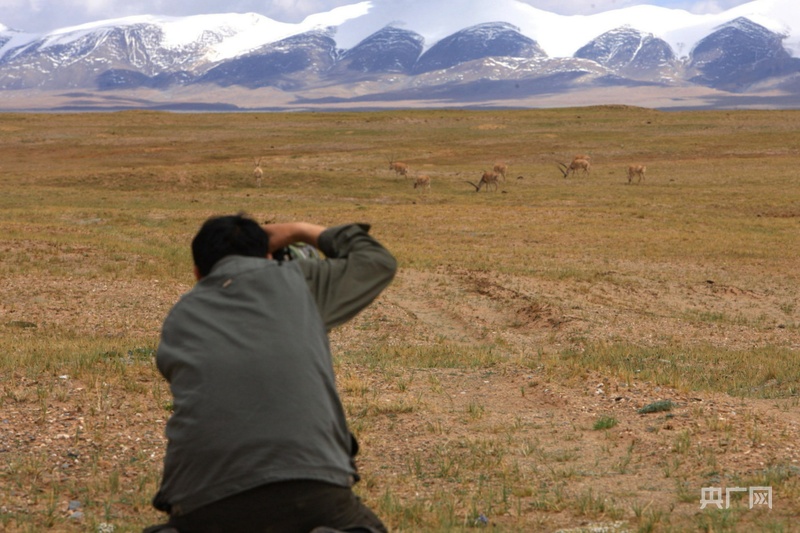 葛玉修跪在草地上,用相机镜头捕捉藏羚羊在草原觅食栖息的影像(央广网发 受访者供图)