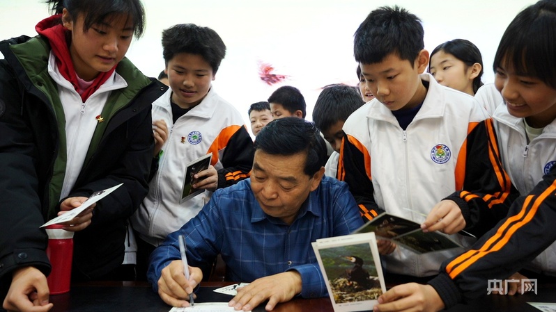 讲座结束后,葛玉修给孩子们题字赠送野生动物画片(央广网记者 汪晓青 摄)
