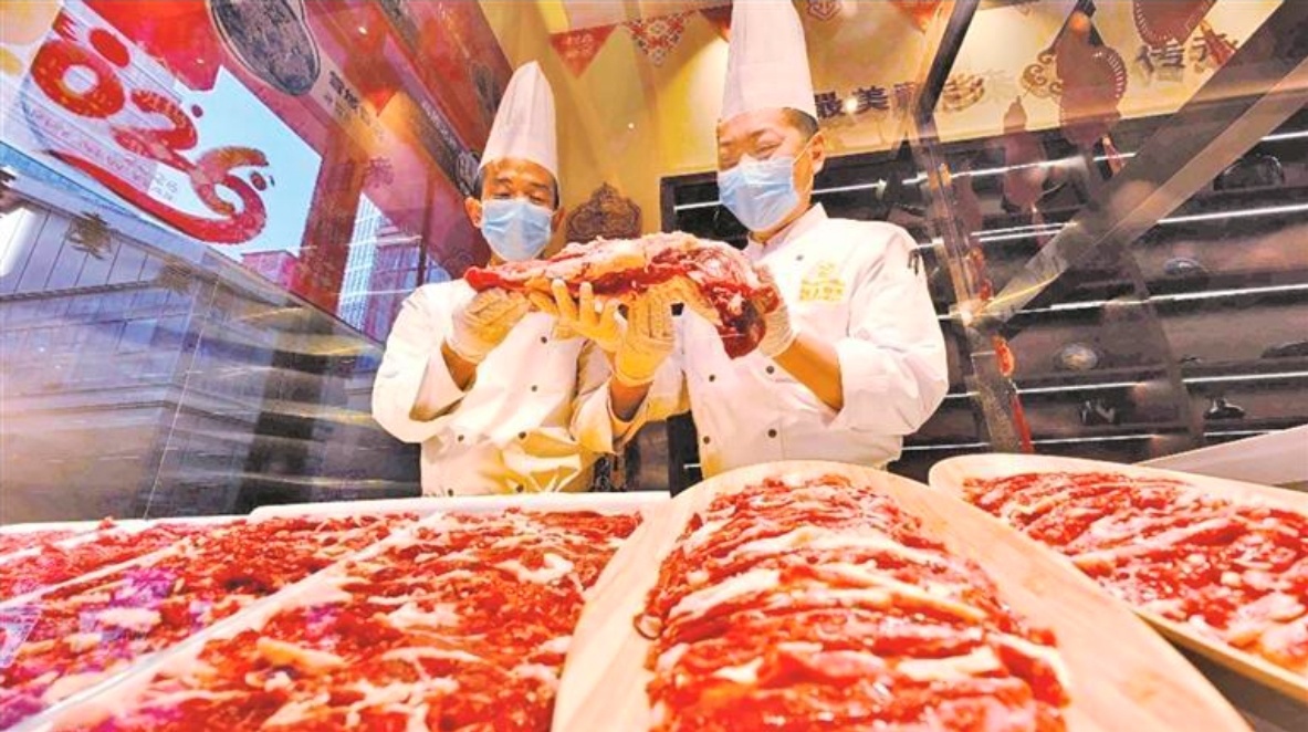 1月23日,西宁一家火锅店内,厨师在分割来自果洛藏族自治州班玛县的新鲜牦牛肉。2025年,该店牦牛肉销量达30吨。这类高原特色产品能跨区域端上城市餐桌,得益于青海冷链物流体系不断完善,也展现出“飞地经济”模式的推广成效。(记者 祁晓军 摄)