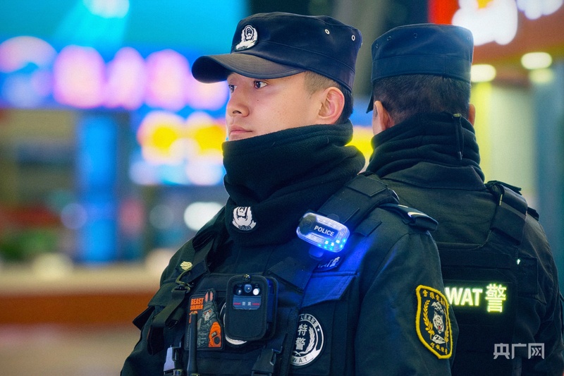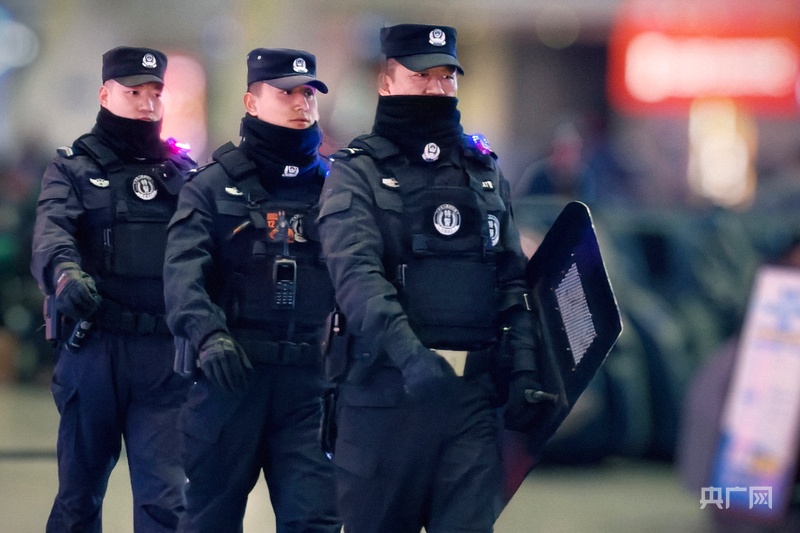 西宁铁路公安处特警支队队员在车站附近夜巡(央广网记者 张海东 摄)