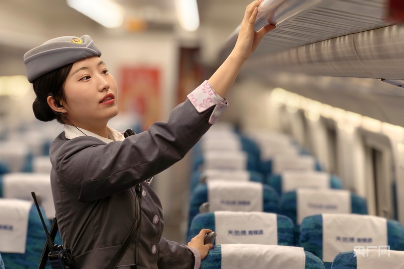 旅客下车后“动姐”依然仔细地清查行李架(央广网记者 张海东 摄)