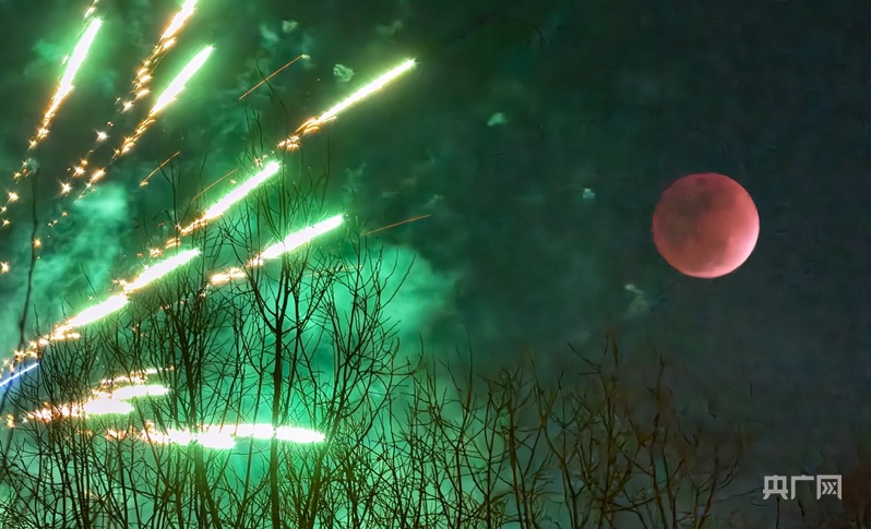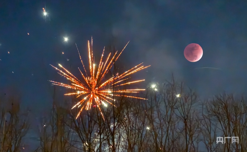 央广网西宁3月3日消息(记者张海东)3月3日,农历正月十五元宵佳节,夜空迎来罕见天文奇观——月全食,“红月亮”与烟花相映成辉,给节日增添了许多浪漫色彩。