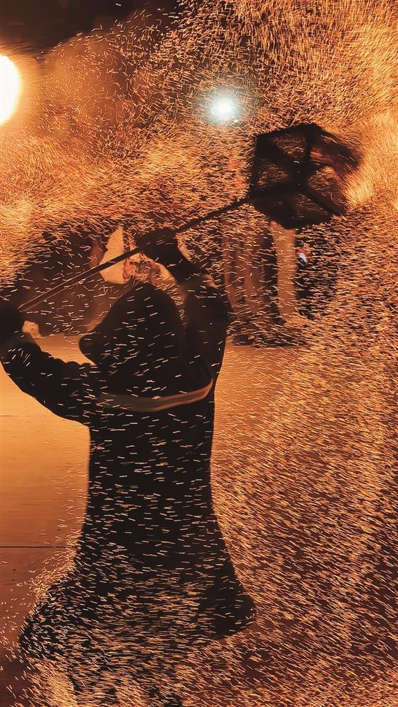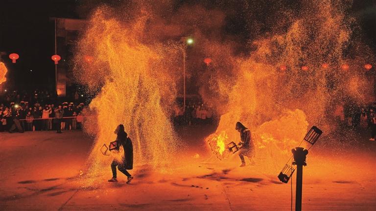“起!”一声吆喝声下,孙长胜舀起炽热的铁水奋力抛向空中,另一人持木板迅猛击打。刹那间,铁花凌空绽放,如流星破空,漫天火星流光溢彩,将夜空照得通亮。每一次惊艳绽放都引来全场欢呼,震撼的画面让观众沉醉不已。