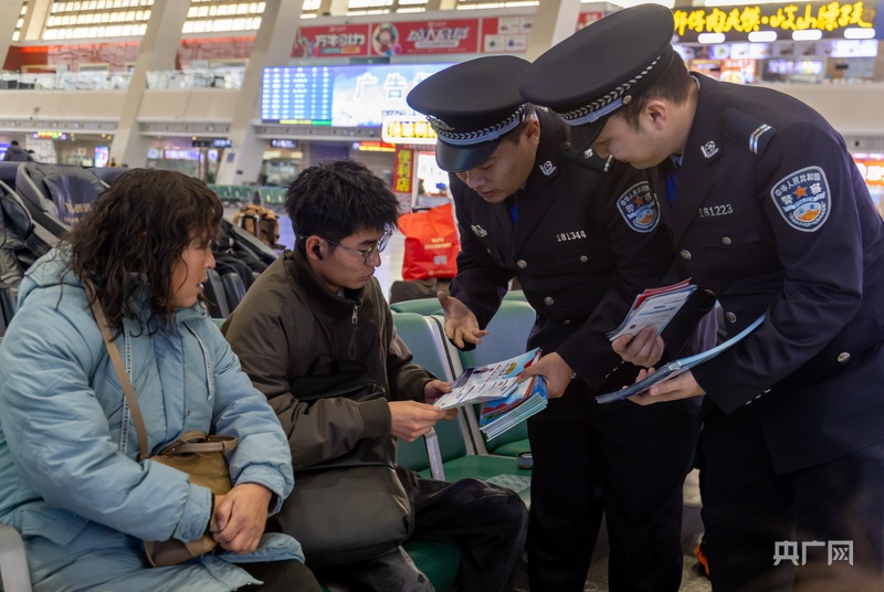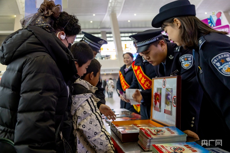 候车厅内暖意涌动,民警联合车站工作人员设点送福,给返乡旅途带来融融暖意。