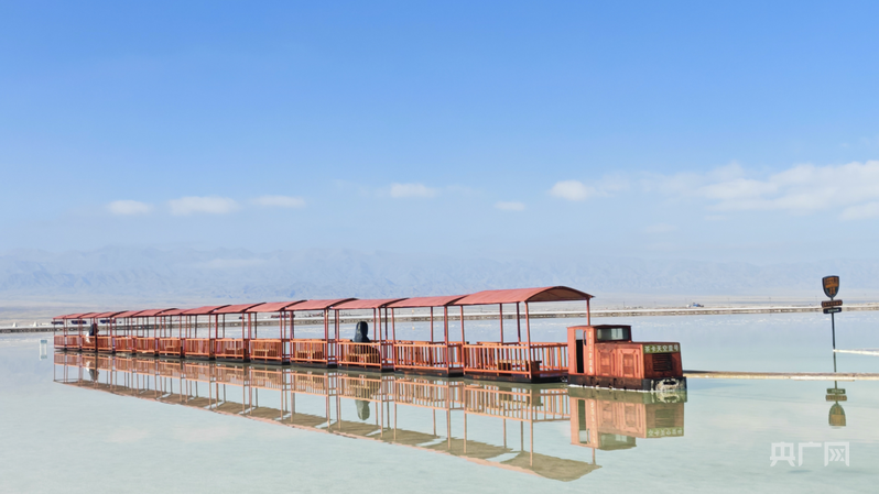 9月26日清晨,采风团伴随着日出抵达茶卡盐湖,宛如镜子般澄澈的湖面,倒映着蔚蓝的天空与絮状的白云。走近盐湖,穿梭于湖面的复古小火车,在纯白色的“天空之城”感受着自然光影的魅力,用相机与文字记录着无与伦比的景象,将自然奇景与人文印记一同纳入创作素材。