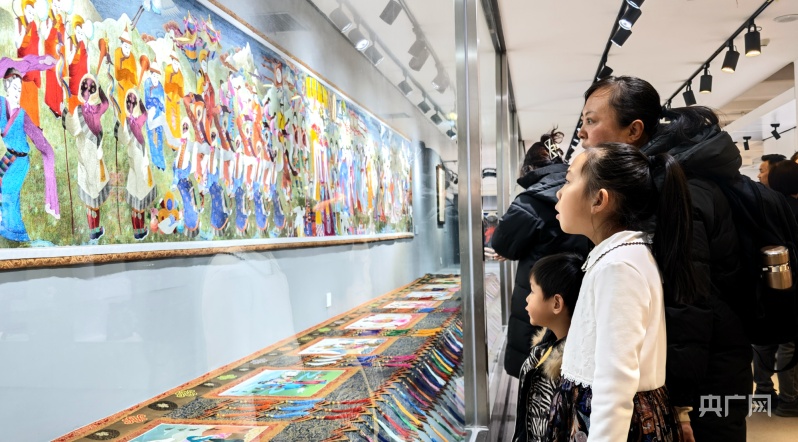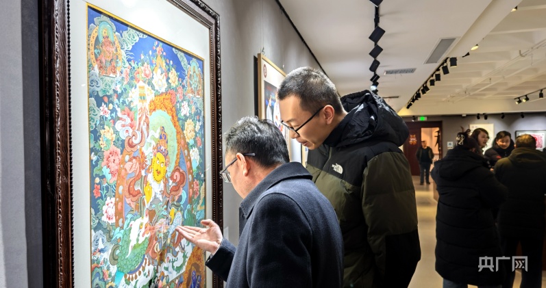 市民群众驻足观赏贵南藏绣作品(央广网记者 汪晓青 摄)