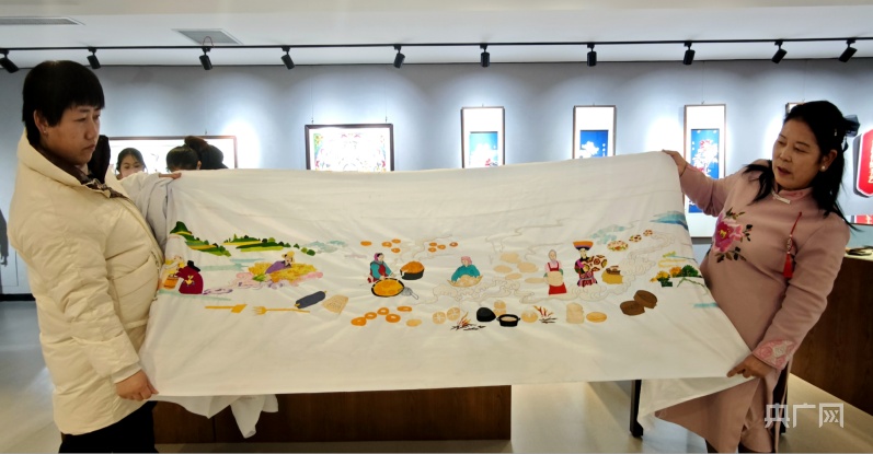 俞兰(右)和绣娘展示青绣作品《千年古驿 岁岁平安》(央广网记者 汪晓青 摄)