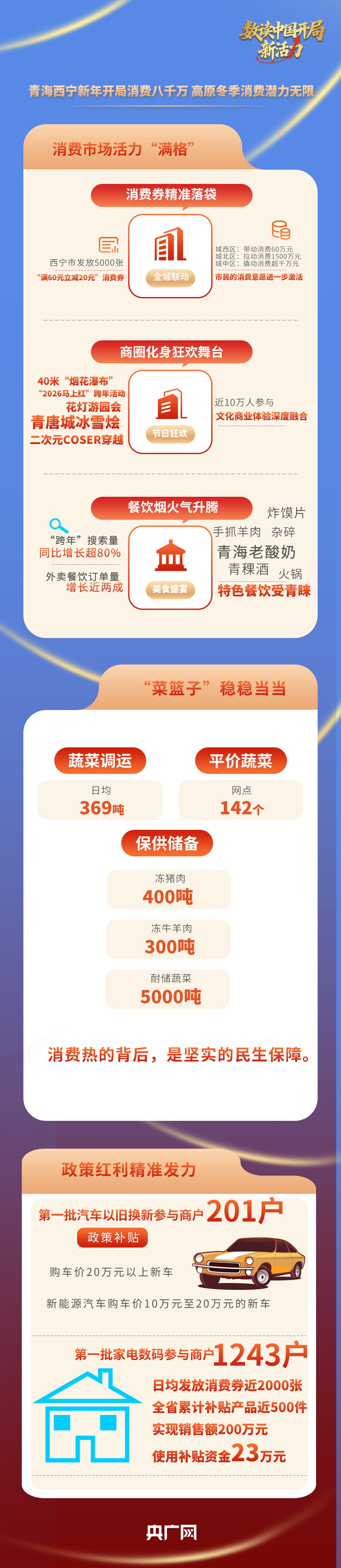 央广网西宁1月15日消息(记者张海东)2026年新年伊始,西宁市各类消费呈现出供需两旺的喜人势头。在多元业态深度融合的助力以及精准政策的有力撬动下,新年前三天假期,西宁市12家重点商贸企业累计实现销售额8693.74万元,同比增长6.05%。消费市场活力“满格”、势头强劲,展现出人们对新一年美好生活的热切期盼。