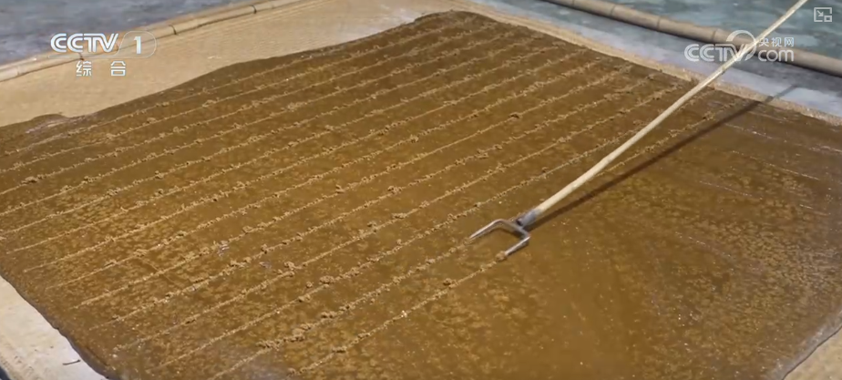 经过近3小时的高温熬煮后,师傅们会将糖浆倒入特制的竹簟上,随后用木质糖刀反复搅打,等到糖浆冷却成固体,表面出现像“蝴蝶花”一样的白色结晶后,就算制作完成了。这种方法做出来的红板糖爽口松脆、清香甘甜、入口即化。