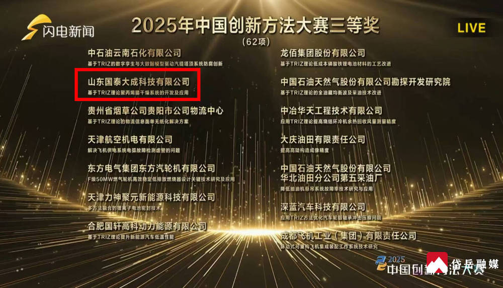 近日,2025年中国创新方法大赛总决赛在泰安落幕。由岱岳区科协组织推送的山东国泰大成科技有限公司,凭借《基于TRIZ理论聚丙烯腈干燥系统的开发及应用》项目荣获三等奖。这是该赛事创办十年来,岱岳区首次实现国赛“零的突破”,同时创下全市参赛以来的最好成绩,彰显了岱岳区企业强劲的科技创新实力。