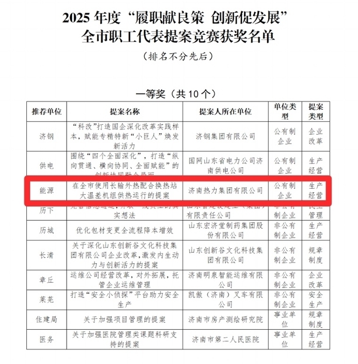 近日,在山东省能源工会组织的2025年“履职献良策创新促发展”山东省能源行业职工代表提案竞赛中,济南能源集团所属热力集团提报的《在集中供热管网局部水力工况不利点投运热电组合型大温差机组的提案》斩获提案一等奖,济南热力集团荣获“优胜单位奖”;此外,热力集团提报的《在全市使用长输外热配合换热站大温差机组供热运行的提案》,在济南市职工代表提案竞赛活动中获得一等奖。这两个提案所获荣誉,充分彰显了企业在深化民主管理、激发职工创新活力及推动供热技术革新方面的显著成效。