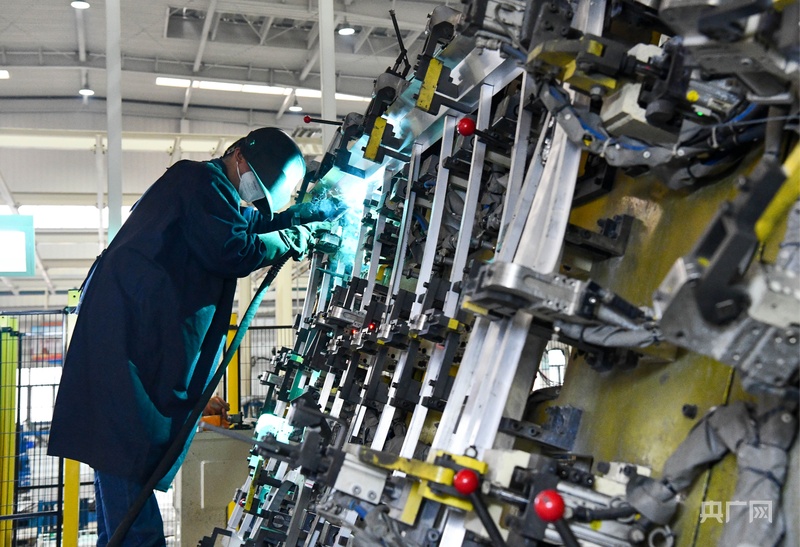 邹平市魏桥轻量化基地全铝车身集成生产线,工人正在焊接全铝小物流车侧围骨架(央广网记者 刘博伦 摄)