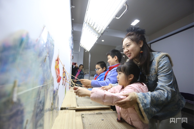 李娟正在教小朋友操纵皮影(央广网记者 唐磊 摄)