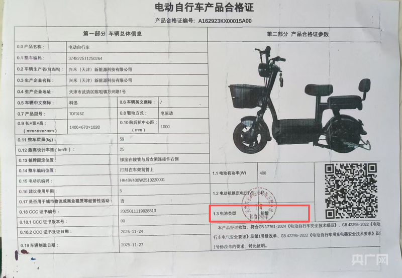 袁先生收到的电动自行车合格证上显示,电池类型为“铅酸”(央广网发 袁先生供图)