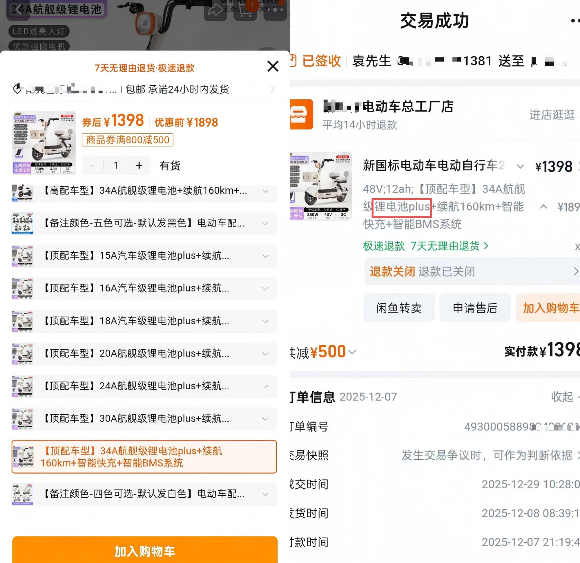 袁先生的购买记录显示拍下的链接及订单都是配备锂电池的电动车(央广网发 袁先生供图)