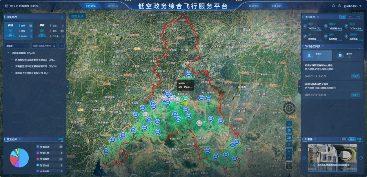 无人机巡航抓拍违停、AI识别火灾隐患、热力燃气水务管线巡检预警、空地联动处置隐患……这些曾经需要大量人力投入的政务工作,如今在济南,正通过一个覆盖全市域的低空政务综合飞行服务平台——济南数字低空飞行管理服务平台实现智能化、高效化运转。
