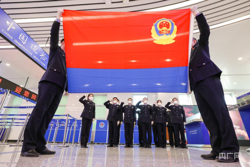 勤务结束后,边检民警重温入警誓词(央广网发 钱程摄)