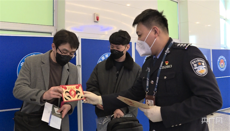 在边防检查区域,旅客收到了由边检民警设计的兔年明信片,同时民警也向旅客介绍了中国人民警察节的由来和意义。“收到边检警察送的春节贺卡感觉很惊喜,我从韩国念书回来,第一个迎接我出站的就是边检警察叔叔,看到他们感觉很亲切,很有安全感。”走出边检通道的袁女士告诉记者。