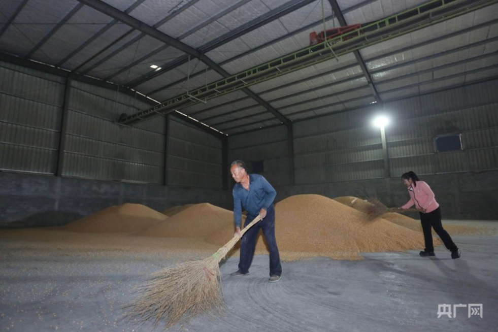 工作人员在山东盛源种业公司秋粮存储区打扫烘干储存的玉米(央广网发 郭志华 摄)