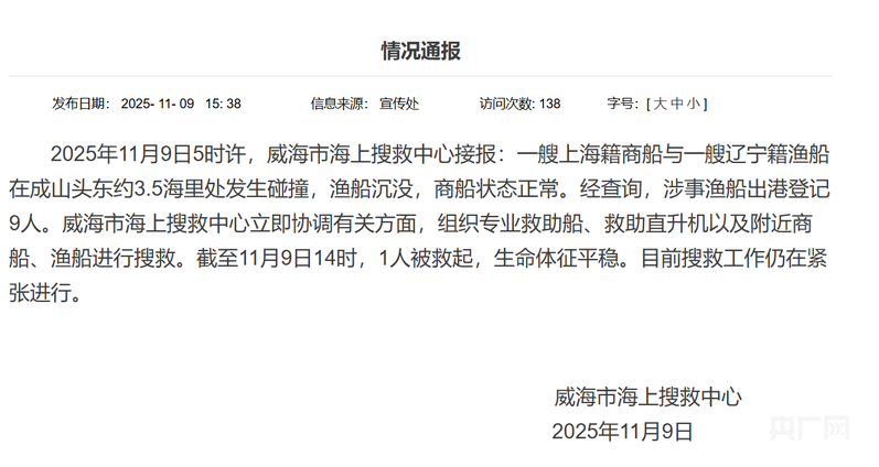 央广网威海11月9日消息(记者程立龙)11月9日16时,记者从威海市海上搜救中心了解到,当日5时许,一艘上海籍商船与一艘辽宁籍渔船在成山头东约3.5海里处发生碰撞,渔船沉没,商船状态正常。经查询,涉事渔船出港登记9人。威海市海上搜救中心立即协调有关方面,组织专业救助船、救助直升机以及附近商船、渔船进行搜救。截至11月9日14时,1人被救起,生命体征平稳。目前搜救工作仍在紧张进行。