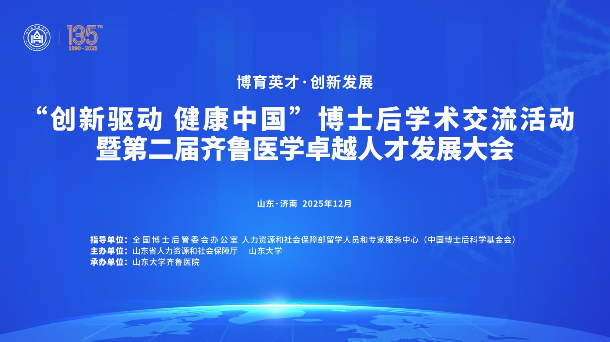 “创新驱动 健康中国”博士后学术交流活动暨第二届齐鲁医学卓越人才发展大会,由全国博士后管委会办公室、人力资源和社会保障部留学人员和专家服务中心(中国博士后科学基金会)指导,山东省人力资源和社会保障厅、山东大学主办,山东大学齐鲁医院承办。