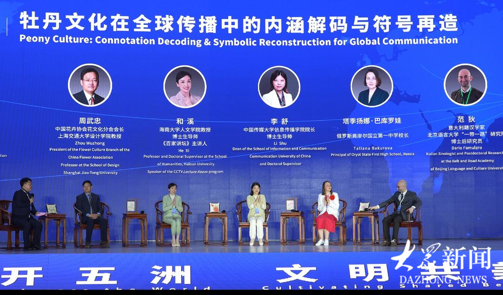 全国青联常委、文化艺术界别副秘书长荣宏君,上海交通大学创新设计中心主任周武忠,海南大学人文学院教授和溪,中国传媒大学信息传播学院院长李舒,青年汉学家,四川外国语大学意大利籍专家范狄,俄罗斯奥廖尔市国立第一中学校长塔季扬娜·巴库罗娃等嘉宾,围绕“牡丹文化在全球传播中的内涵解码与符号再造”开展圆桌讨论。(大众新闻记者 赵琳 王兆锋)